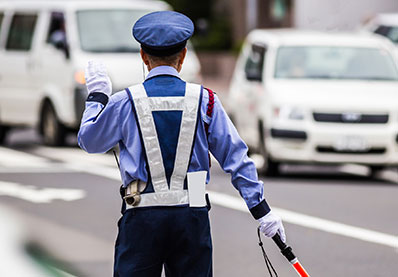 各種工事(水道・ガス・電気・道路・建築など)における交通警備や駐車場(ショッピングセンター・イベント会場・各種施設)などの道路横断などのい交通誘導を行っています。
